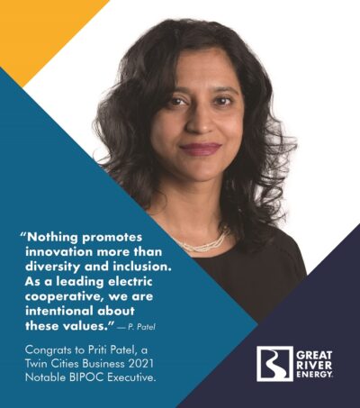 Great River Energy’s Vice President and Chief Transmission Officer Priti Patel was recently named a Twin Cities Business 2021 Notable BIPOC Executive.